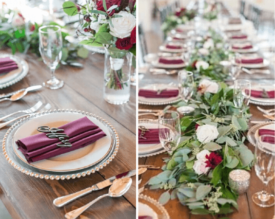 Burgundy and dark blue is a deep wedding color combinations and pink color makes it more feminine. Burgundy, dark blue and blush winter wedding color palettes ideas 2020: burgundy bridesmaid dresses, white bridal gown and white wedding veil, pink and burgundy wedding bouquets, wooden wedding tables and burgundy napkins, dark blue suits for groom and groomsmen and burgundy ties…