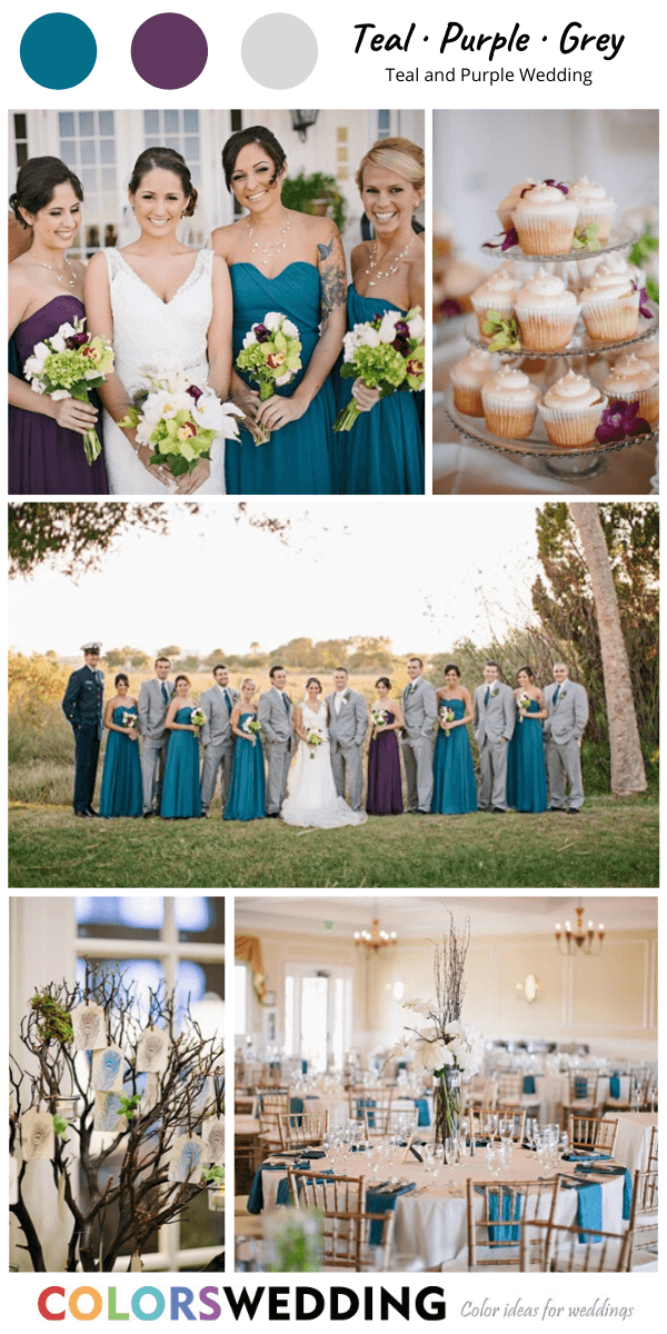 Grey is among the most popular colors for weddings, it’s neutral, chic and fits any season, it is a very perfect complement for your teal and purple color palette. There are so many beautiful centerpieces that can use to adorn your wedding: teal dresses and purple dresses for your bridesmaid, white bridal gown, grey groom attires, white purple bouquets, grey decoration, wedding dessert with purple flowers and teal napkin. These unique wedding ideas for your ceremony are sure to make a last impression.