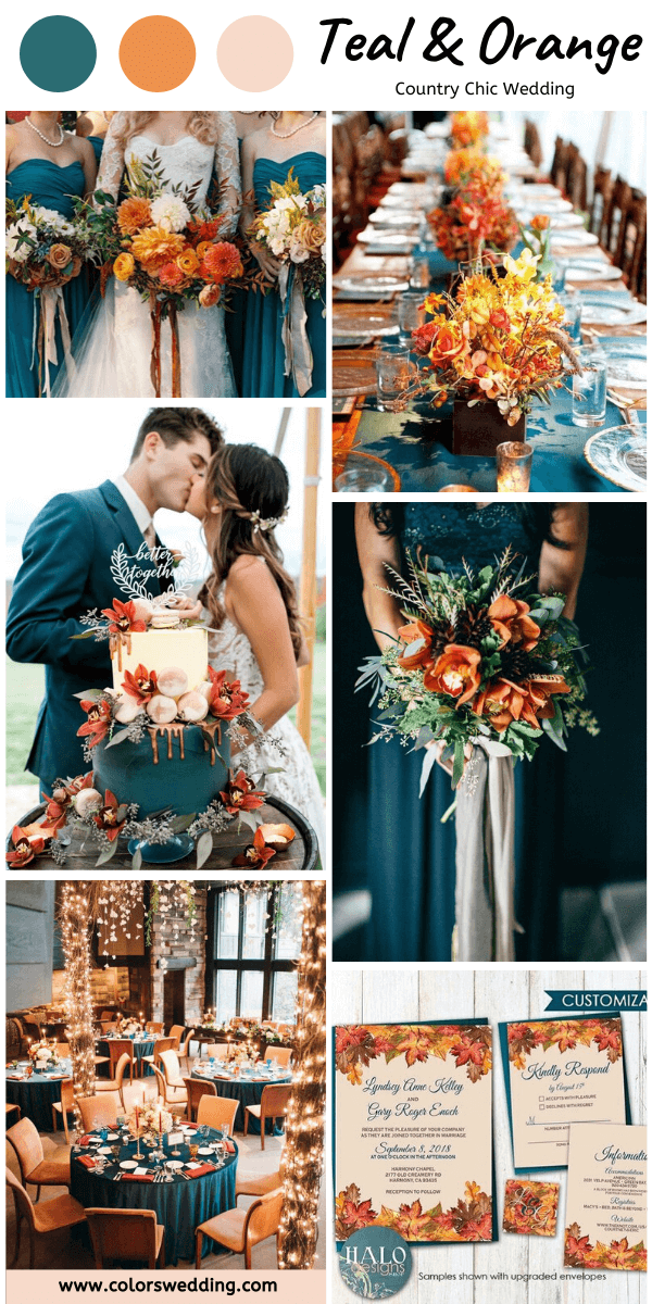 Teal combines the calming properties of blue with the renewal qualities of green. Teal and orange is a beautiful palette for your country wedding. Check these out: teal bridesmaid dresses, white bridal gown, teal men suit, white orange bouquets, teal table cloth, orange wedding chair, teal orange white invitation and white teal wedding cake with orange flowers. Find inspiration from these color ideas perfect for country wedding.
